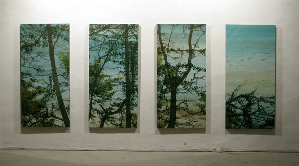 Installation vues d‘exterieur, 4 grossformatige Bilder eines lichten Waldhains der Unterwalliser Künstlerin Valérie Gross.