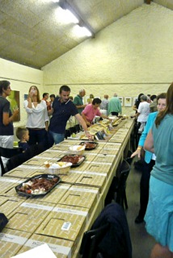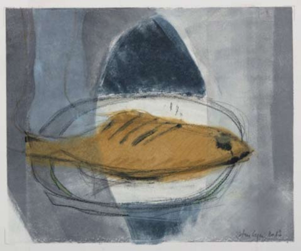 Stefan Eyer, Künstler, Architekt und leidenschaftlicher Koch präsentiert in seiner Ausstellung Bilder beim Essen, Bilder zum Wohnen grossformatige Acrylbilder, Monotypien und eigene Kochrezepte. Die sehr aussagekräftige Installation seiner multifunktionalen Tische kombiniert mit dem Stuhl Classic von Horgenglarus weckte das Bild einer langen reichhaltig gedeckten Tafel an der geschwelgt, getrunken und gelacht wird. Auf diese Art wurde diese einladende Tisch-Installation auch während der Ausstellung immer wieder genutzt.