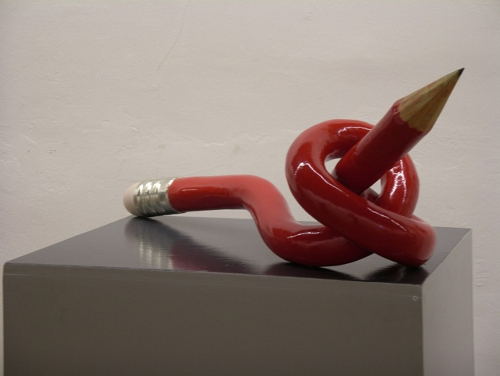 So veranlasst der rote Bleistift, über Wert und Dimension planerischer oder künstlerischer Arbeit nachzudenken- oder auf ihr Fehlen aufmerksam zu machen. Denn übersetzt bedeutet den Rotstift ansetzen ja auch, dass gespart werden soll, was nicht nur auf einen Mangel, sondern oft auch auf eine falsche Rechnung verweist. Wo mit dem Rotstift hantiert wird, kommen meistens die zu kurz, die sich ohnehin schon mit dem kleinsten Budget zufrieden geben müssen, was einem auf die Idee bringt, die Verantwortlichen hätten einen Knopf in der Leitung. Oder, wie in einem anderen Werk veranschaulicht wird, ein Brett vor dem Kopf.“