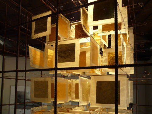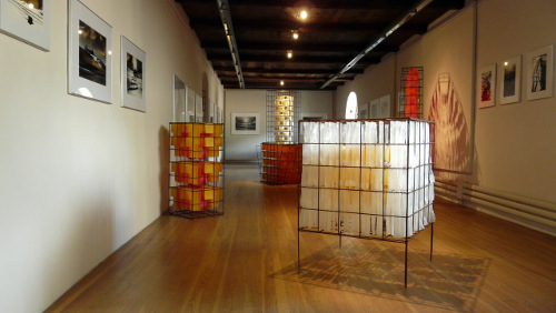 grossformatigen Schwarz / Weiss Silbergelatine – Baryt Vergrösserungen. Dem stellt Marisa Fuchs lichtdurchflutete Kuben aus Armierungseisen mit wachsgetränkten Pergamentpapier-Fahnen entgegen, in denen sie sich mit Leben und Werk von Aung