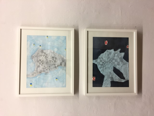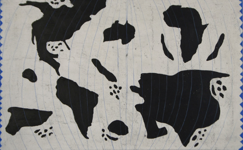 Spielerisch zeichnet sie ein Szenario der Verschiebung der Kontinente auf. Sie erschafft sozusagen eine neue Interpretation der geographische Ordnung, welche jedoch einem steten Wandel unterzogen ist. Gewisse Territorien verschwinden und neue erscheinen wie z.Bsp. der 6. Kontinent, gebildet aus den sich in den Ozeanen angesammelten Abfallbergen.